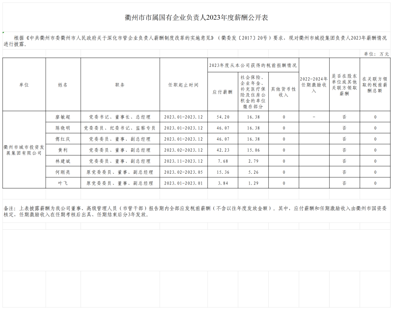 衢州市市屬國有企業(yè)負責人2023年度薪酬公開表