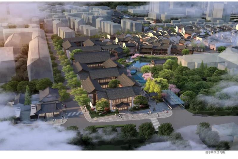 區(qū)塊三處于鐘樓和南孔家廟之間,建筑總面積約28000㎡,區(qū)塊內(nèi)文化展示以儒學(xué)文化為主題,形成文化體驗(yàn)研學(xué)教育旅游觀光于一體的文化展示區(qū)。設(shè)計(jì)中亦植入了關(guān)于菱湖的歷史記憶,在該區(qū)塊東部區(qū)域展示了大片湖面,建筑上采用宋式風(fēng)格,以再現(xiàn)菱湖的歷史風(fēng)韻。
