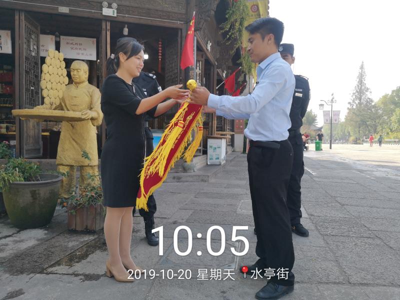 今天上午,水亭門邵永豐商鋪店長(zhǎng)手持一面印有“情系商戶,真情服務(wù)”金色大字的錦旗送到保安隊(duì)長(zhǎng)周國(guó)洲手上,由衷感謝街區(qū)保安隊(duì)給予的優(yōu)質(zhì)服務(wù)。