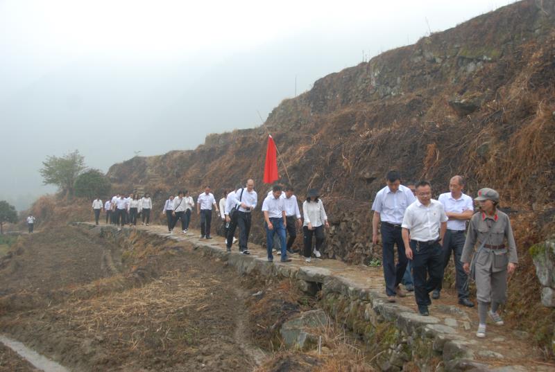 黨員干部們懷著無(wú)比崇敬的心情參觀了傅春齡故居,并在故居內(nèi)的巨幅黨旗前莊嚴(yán)宣誓。隨后,大家一起重走了全程2.5公里的紅軍路,紅軍路由大小石塊壘砌成臺(tái)階,蜿蜒在山田間,這條路曾是通往遂昌、福建、江西等地的咽喉要道,粟裕將軍率領(lǐng)的挺進(jìn)師就曾經(jīng)走過(guò)這里。在沿途,還能見(jiàn)到紅軍墻和紅軍石,紅軍石是一塊巨大的紅砂巖,底下有個(gè)非常隱蔽的洞穴,當(dāng)年老百姓和紅軍常通過(guò)這個(gè)洞穴傳遞情報(bào)和糧食。