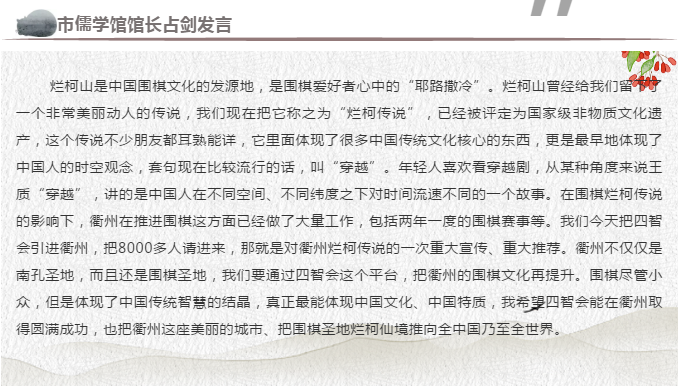 爛柯仙境、衢州有禮。在第四屆全國(guó)智力運(yùn)動(dòng)會(huì)倒計(jì)時(shí)10天之際,四智會(huì)開(kāi)幕式新聞發(fā)布會(huì)在爛柯山景區(qū)舉行,10余家省市主流媒體前來(lái)助陣,向世界傳播爛柯山圍棋圣地的獨(dú)特魅力。市政府副秘書(shū)長(zhǎng)吳劍波、市體育局局長(zhǎng)汪暉、衢州中國(guó)儒學(xué)館館長(zhǎng)占劍和四智會(huì)開(kāi)幕式總導(dǎo)演羅可歌參加。