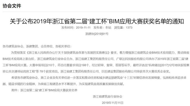 11月11日,浙江省建筑行業(yè)協(xié)會(huì)公布了2019年浙江省第二屆“建工杯”BIM應(yīng)用大賽獲獎(jiǎng)名單,四省邊際中心醫(yī)院項(xiàng)目獲工民建組別一等獎(jiǎng)。本次大賽由浙江省建筑業(yè)行業(yè)協(xié)會(huì)主辦,浙江省建工集團(tuán)有限責(zé)任公司、廣聯(lián)達(dá)科技股份有限公司承辦。大賽自4月發(fā)布通知以來,審核通過184個(gè)項(xiàng)目,最終有33個(gè)項(xiàng)目進(jìn)入決賽,工民建綜合組18個(gè),市政機(jī)電組15個(gè)。