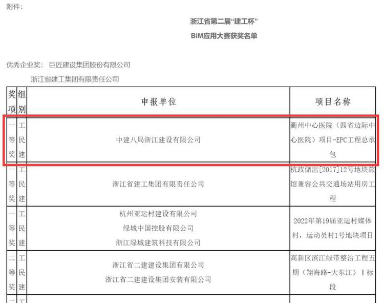 喜報(bào)! | 四省邊際中心醫(yī)院項(xiàng)目獲2019年浙江省第二屆“建工杯”BIM應(yīng)用大賽工民建組別一等獎(jiǎng)