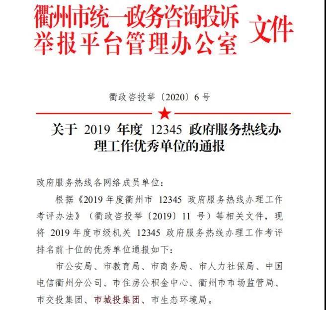 3月16日,衢州市統(tǒng)一政務(wù)咨詢投訴舉報(bào)平臺(tái)管理辦公室發(fā)布《關(guān)于2019年度衢州市政府服務(wù)熱線辦理工作優(yōu)秀單位的通報(bào)》,市城投集團(tuán)榮獲“2019年度12345政府服務(wù)熱線辦理工作優(yōu)秀單位”。