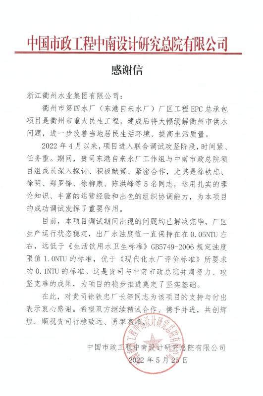 近日,市城投水業(yè)集團(tuán)收到一封中國市政工程中南設(shè)計(jì)總院有限公司發(fā)來的感謝信。信中,中國市政工程中南設(shè)計(jì)總院對市城投水業(yè)集團(tuán)東港自來水廠工作組在項(xiàng)目聯(lián)合調(diào)試階段積極獻(xiàn)策、緊密合作,為項(xiàng)目成功調(diào)試所發(fā)揮的重要作用表示了感謝。